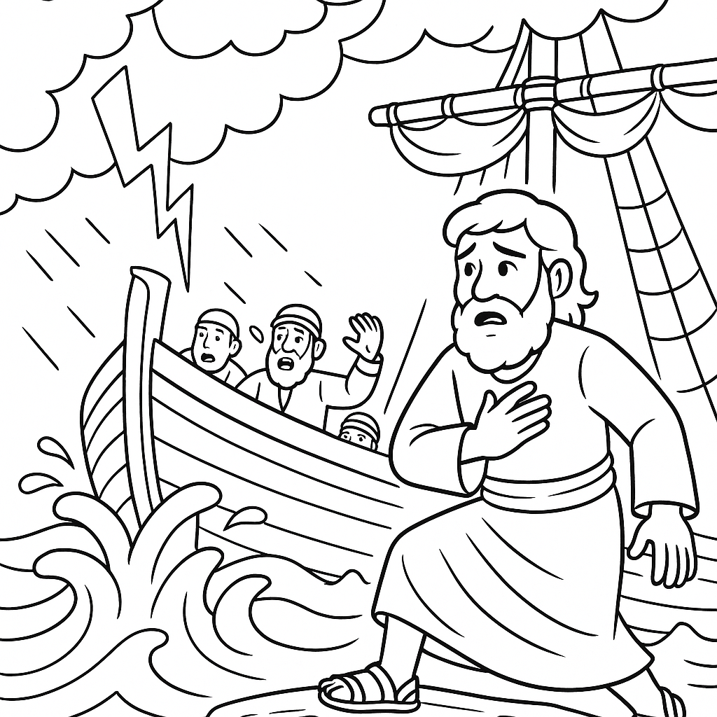 Mas Jonas não quis obedecer. Ele ficou com medo e tentou fugir de Deus. Então, ele entrou em um navio que ia para bem longe. Durante a viagem, uma grande tempestade começou a balançar o barco, e todos os marinheiros ficaram assustados.