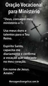 “Deus, consagro meu ministério a Ti. Usa meus dons e talentos para o Teu Reino. Espírito Santo, capacita-me diariamente e confirma a vocação que colocaste no meu coração. Em nome de Jesus. Amém.”