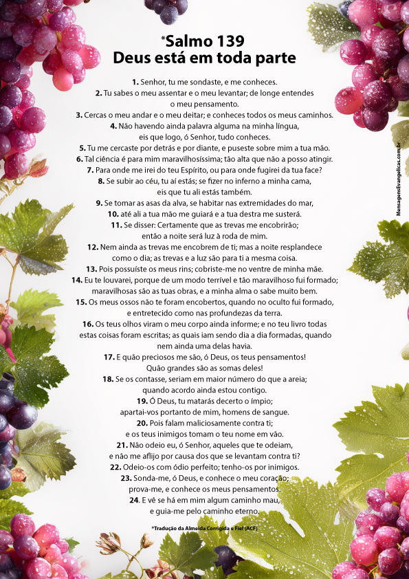 Ao longo deste salmo, somos conduzidos a refletir sobre três grandes verdades: Deus nos conhece por completo, Deus está conosco em todo lugar e Deus nos formou com propósito. Cada versículo nos convida a olhar para dentro, reconhecer quem somos diante de Deus e permitir que Ele nos conduza pelo caminho eterno.